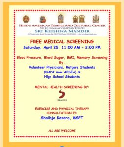 Health Fair and Mental Health Screening, Guruvayoorappan Temple, Morganville, NJ