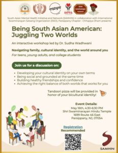 | FreeSouth Asian Mental Health Initiative and Network (SAMHIN) has partnered with Swaminarayan Temple in Parsipanny, New Jersey to organize this exciting workshop. Dr. Sudha Wadhwani will conduct this interactive workshop. This workshop for teens, college students and young adults who are coming of age and trying to find a way to navigate both their family/cultural identity and the social world around them. It can be hard to balance two worlds that can feel so different and clash at times. Join us in connecting with your peers and learning strategies to feel more understood and opening conversation with your parents and families. We will discuss how to manage the expectations and pressures from both worlds, as you determine your own identity… personally, socially, academically, and professionally. Topics will include developing your cultural identity on your own terms; being social and grounded at the same time; building healthy friendships and confidence; and achieving the right balance of both worlds that works for you.