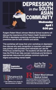 Shruthi Thiyagarajan, Drashya Shah, Shree Gogineni and Riddhi Jadhav, medical students at Robert Wood Johnson Medicali School, will discuss the importance of depression screening using easily available free screening tool, Patient Health Questionnare, (PHQ) and discuss its role in preventive care in children and adults. This workshop is a collaboration between Robert Wood Johnson Medical School, SAMHIN and East Brunswick Public Library.